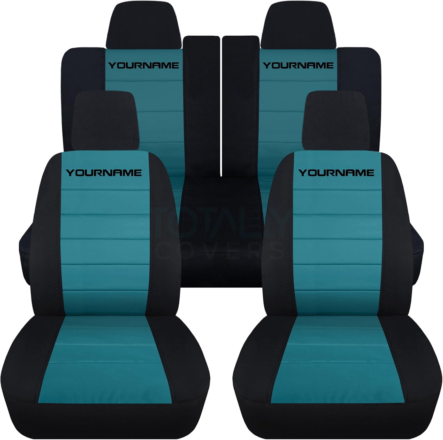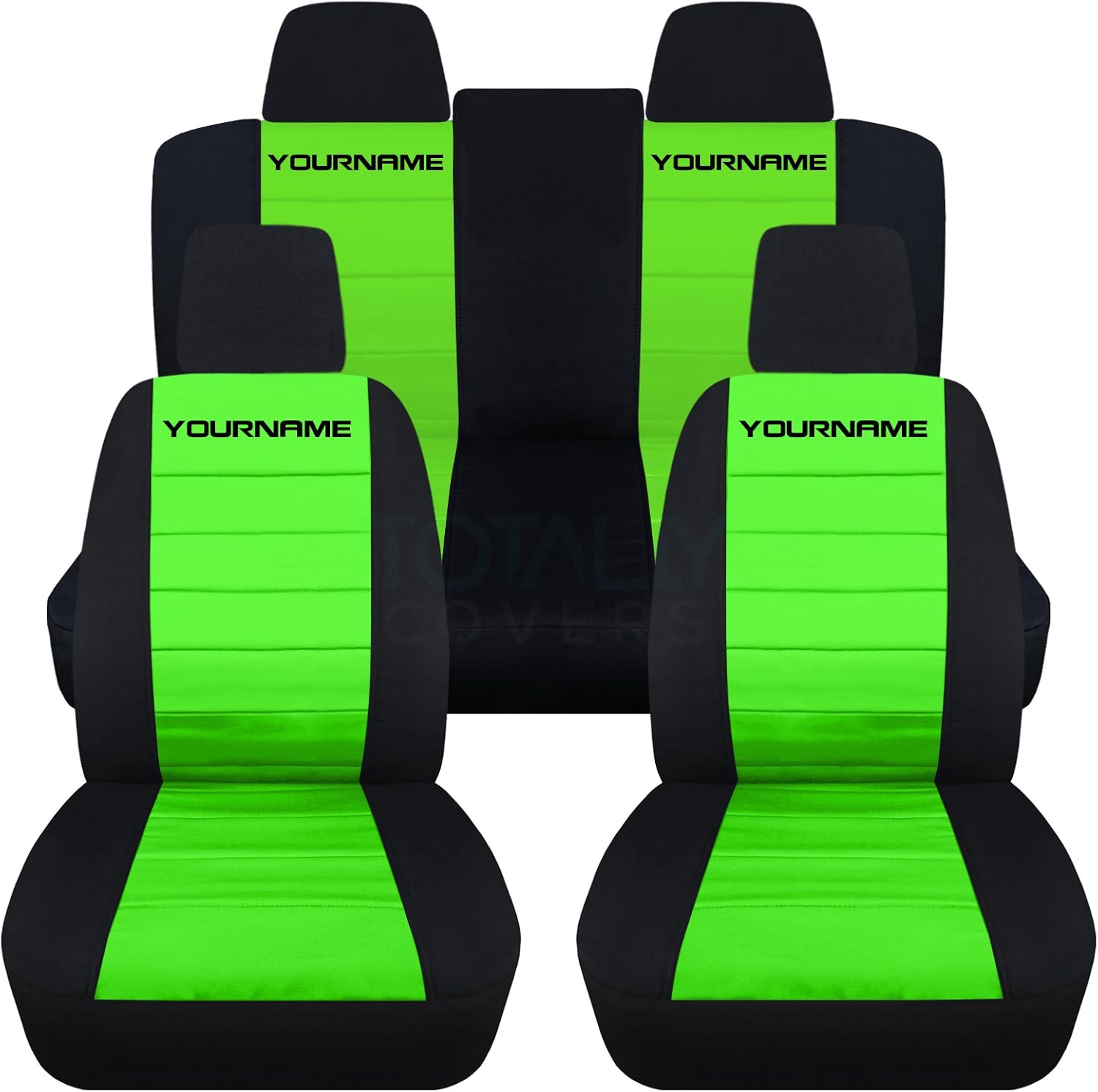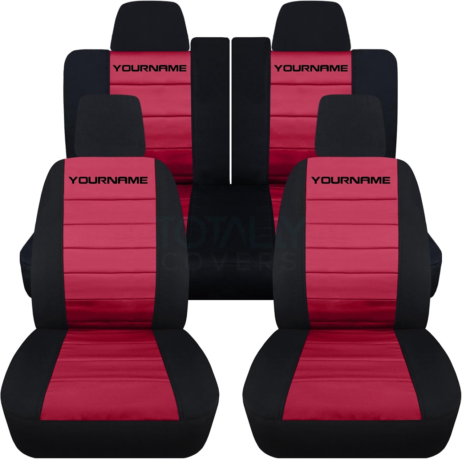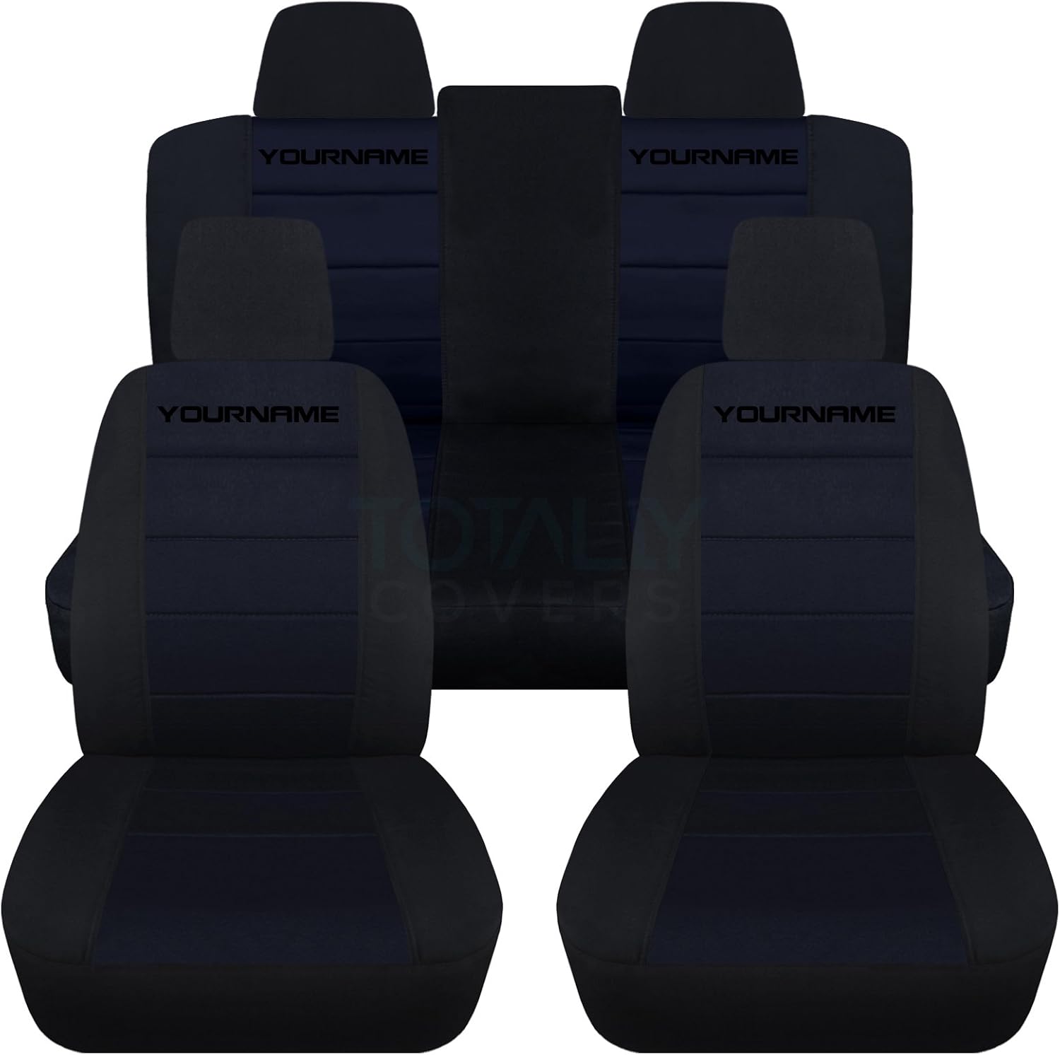 A full set of front and rear, black and purple car seat covers, with your name or text, for a 5th generation (2011) Ford Mustang V6/GT Convertible with a rear bench with solid back. Be sure to visit our storefront ("Totally Covers") where you can find the largest selection of seat covers, to satisfy even the most demanding of tastes. If you can't find what you are looking for, please contact us ("Totally Covers") We can make seat covers for ANY car, truck, van, RV or SUV in a variety of 145 colors and prints, and even add your name/text and logo/design on them!