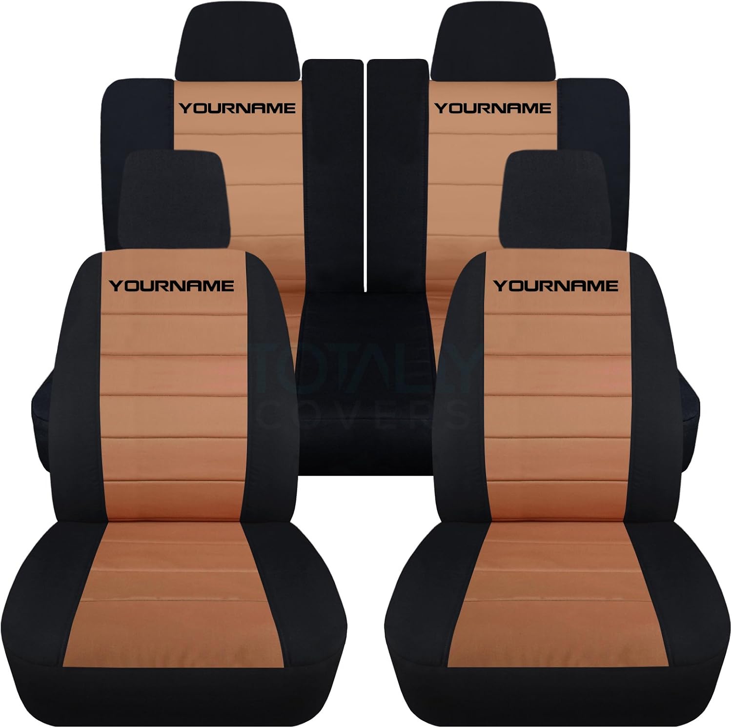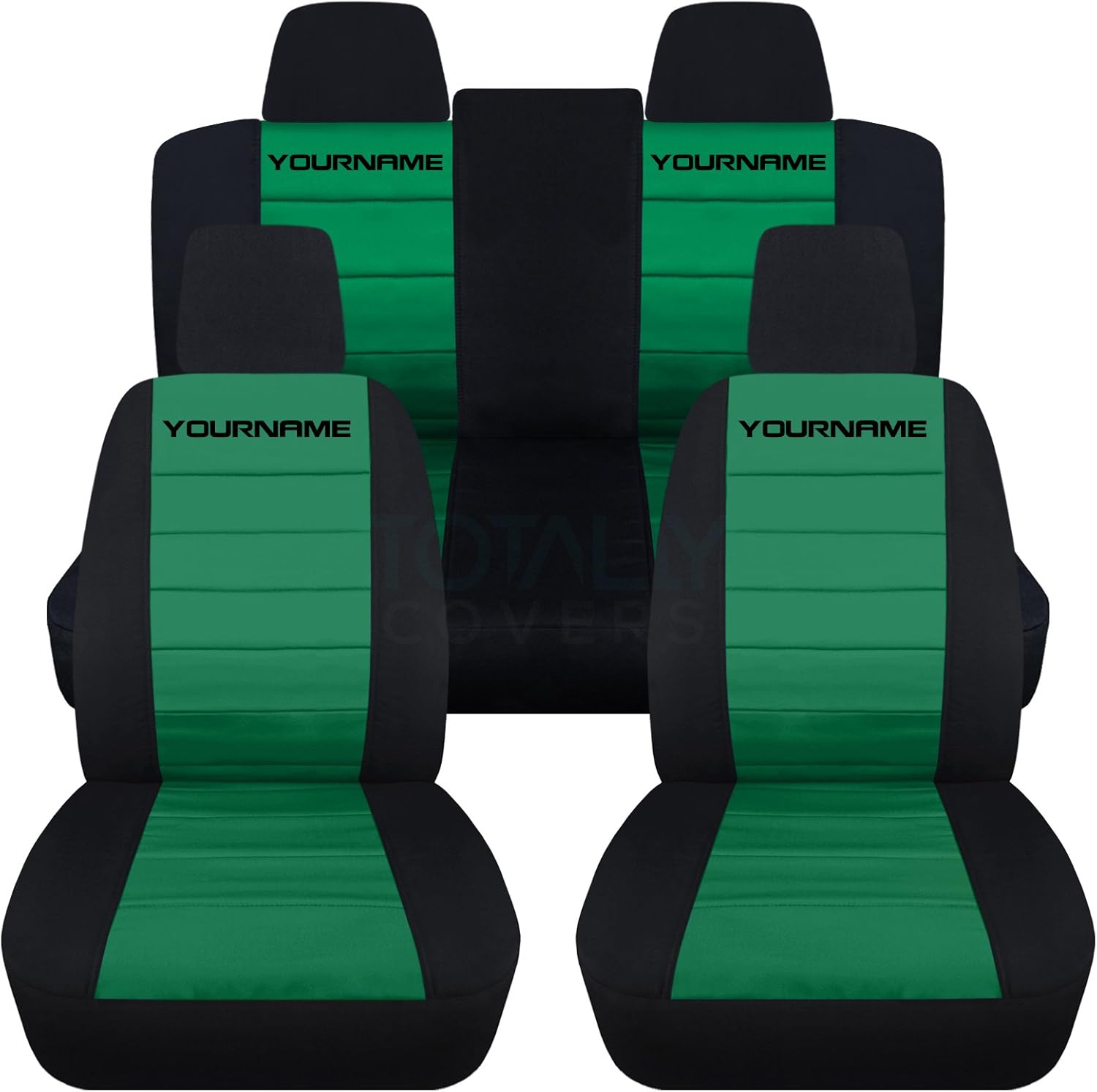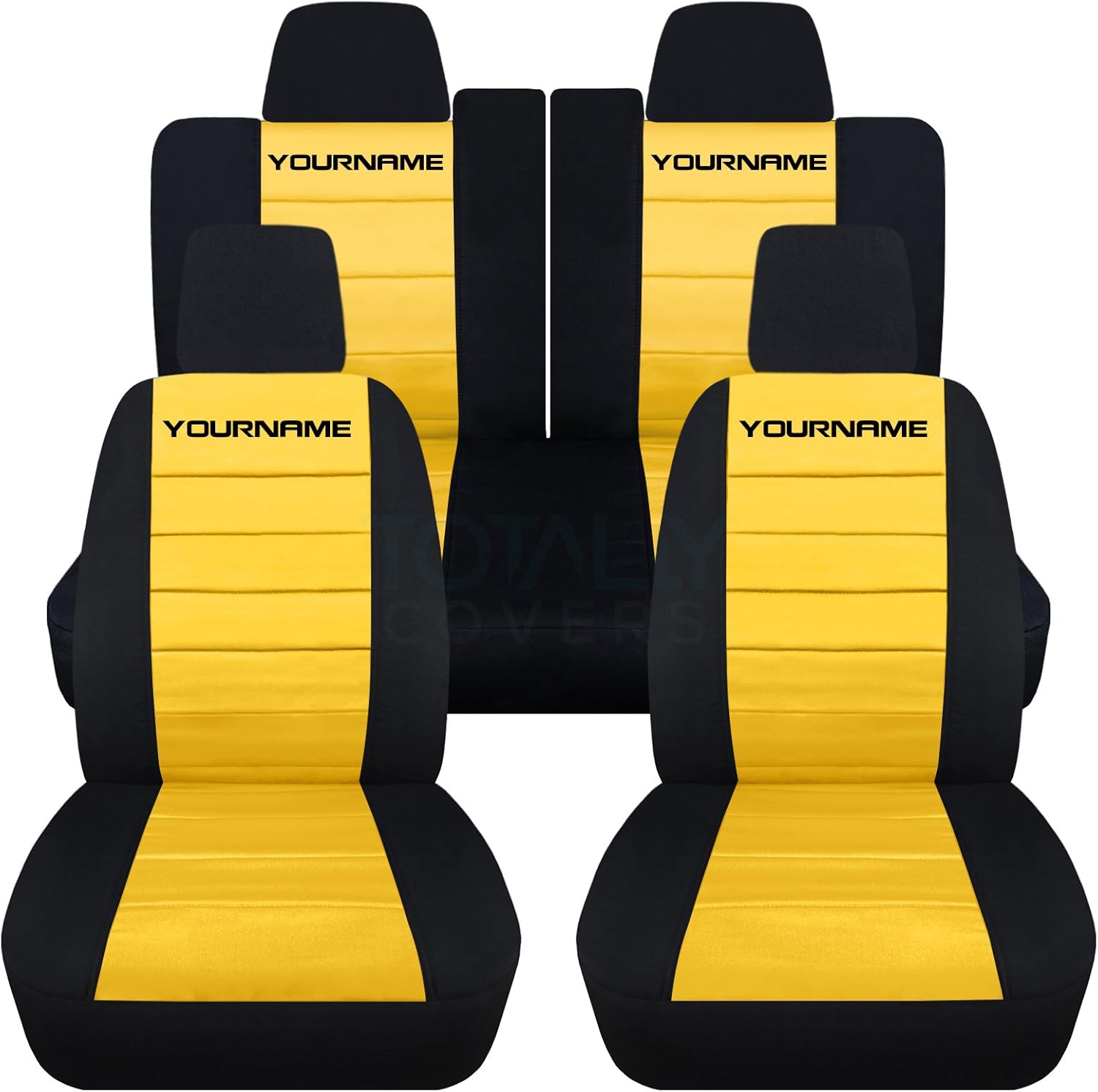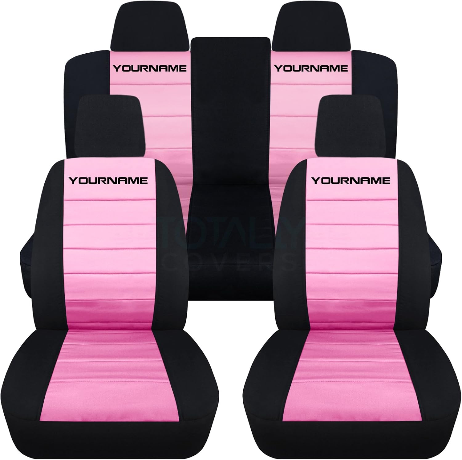 A full set of front and rear, black and purple car seat covers, with your name or text, for a 5th generation (2011) Ford Mustang V6/GT Convertible with a rear bench with solid back. Be sure to visit our storefront ("Totally Covers") where you can find the largest selection of seat covers, to satisfy even the most demanding of tastes. If you can't find what you are looking for, please contact us ("Totally Covers") We can make seat covers for ANY car, truck, van, RV or SUV in a variety of 145 colors and prints, and even add your name/text and logo/design on them!