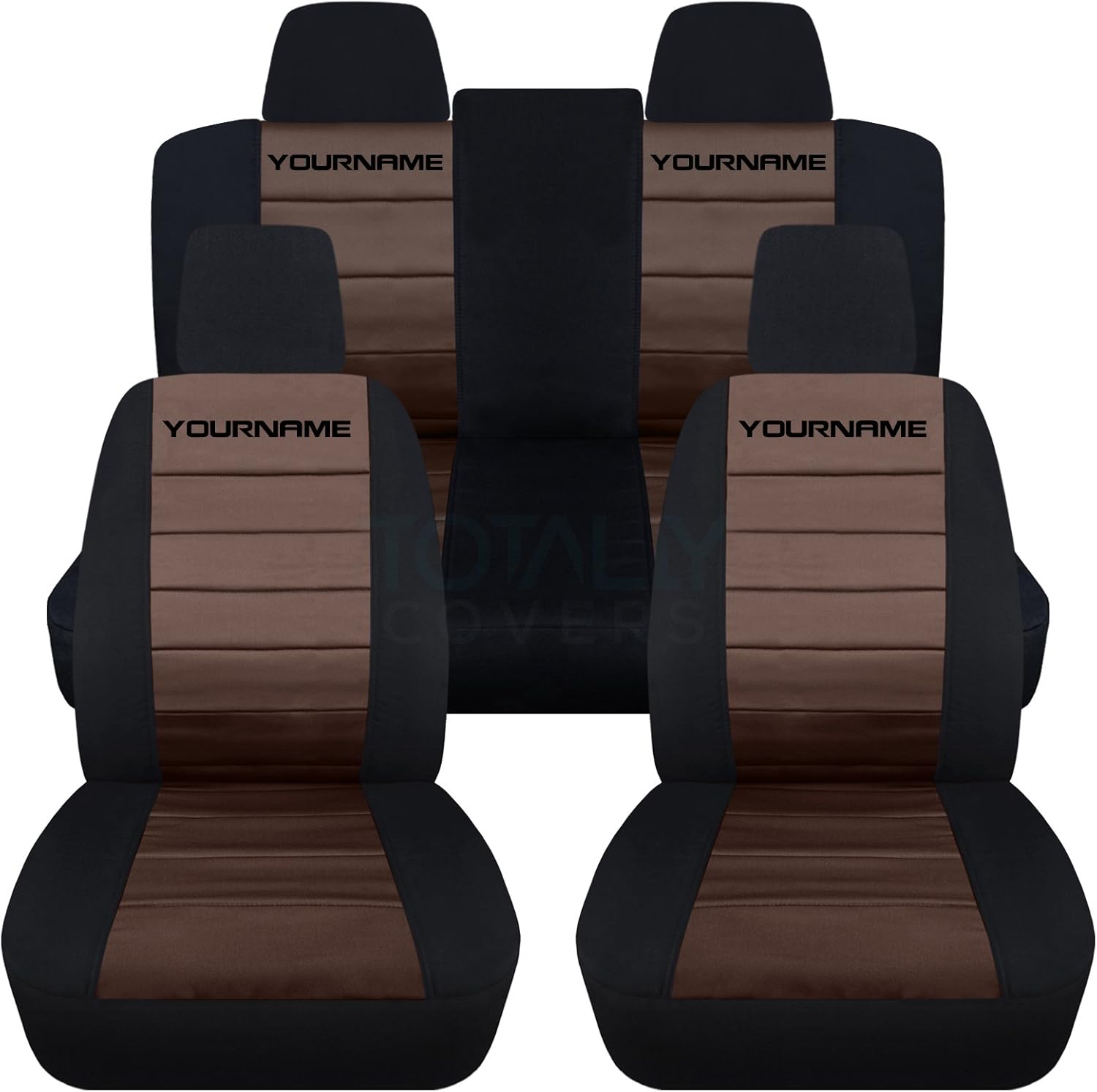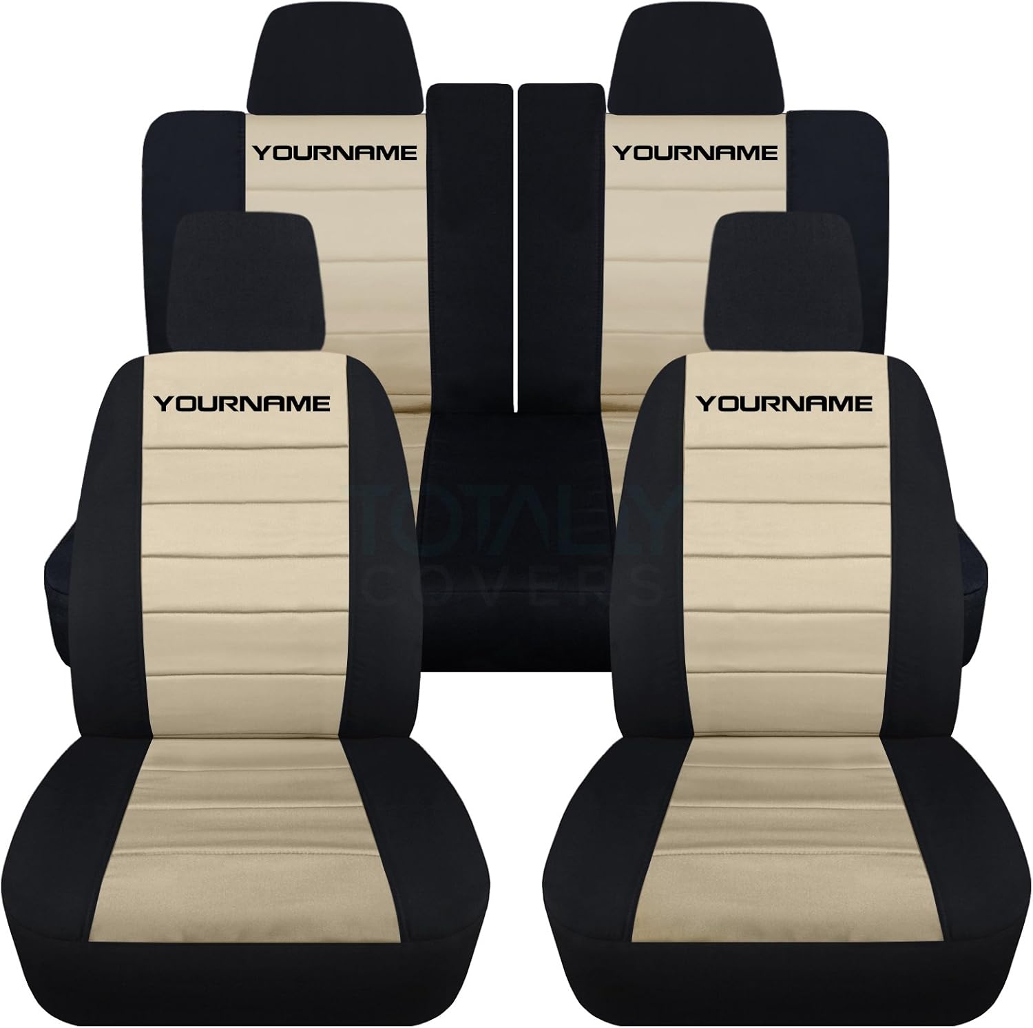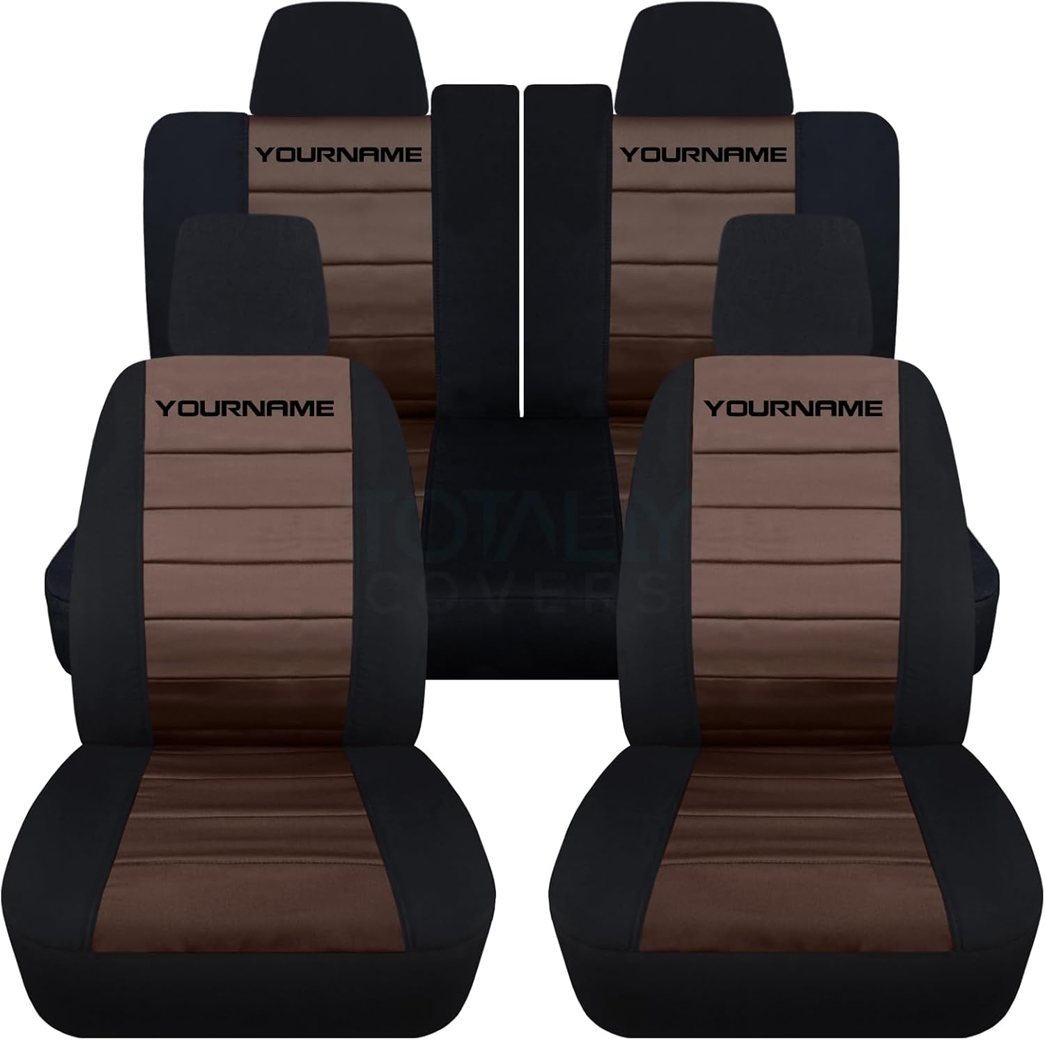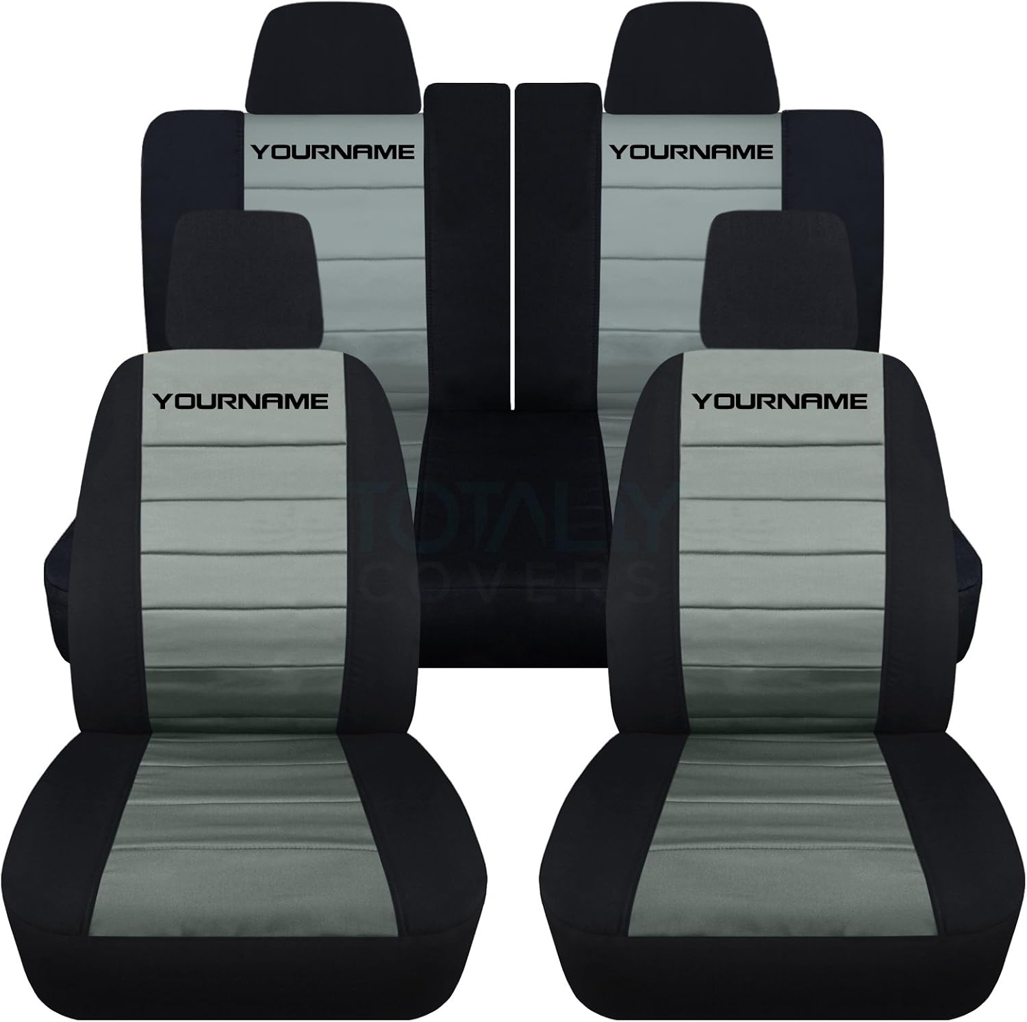 A full set of front and rear, black and purple car seat covers, with your name or text, for a 5th generation (2011) Ford Mustang V6/GT Convertible with a rear bench with solid back. Be sure to visit our storefront ("Totally Covers") where you can find the largest selection of seat covers, to satisfy even the most demanding of tastes. If you can't find what you are looking for, please contact us ("Totally Covers") We can make seat covers for ANY car, truck, van, RV or SUV in a variety of 145 colors and prints, and even add your name/text and logo/design on them!