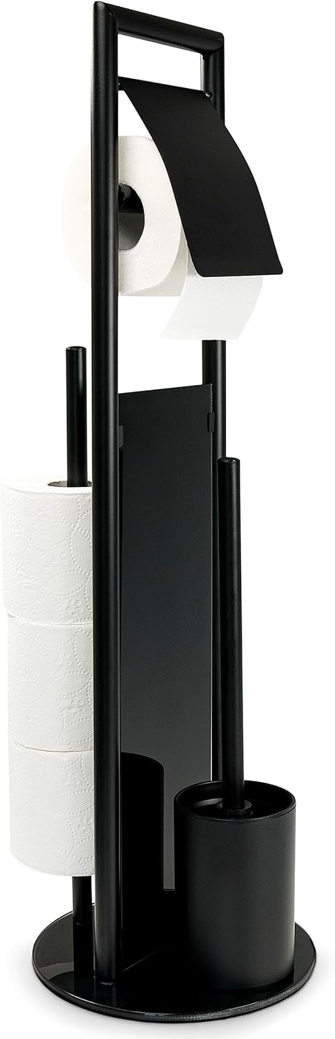 The high-quality Ravina stand toilet set made of rust-proof, matte stainless steel, combined with black, tempered safety glass sets decorative design accents in the bathroom. It is a practical 3-in-1 combination and offers an open toilet brush holder including toilet brush, toilet roll holder and a spare roll holder. This means that all utensils are always within easy reach. The combination of the deep black, shiny glass elements with the matte stainless steel of the frame gives the toilet set an elegant look. Simple, puristic design and clear shapes add highlights to any bathroom. The toilet roll holder at handle height is equipped with a cover made of rust-proof stainless steel. The paper rolls can be easily unrolled and do not slip as the holder is closed. It is easy to replace the toilet wheels by removing the handle. Another practical highlight of this toilet set is the integrated replacement roll holder, which offers space for three wheels. The replacement rollers are therefore always ready for refilling. As a design element, a cutting disc made of black glass is integrated, which visually separates the spare roll holder from the toilet stand. With the open toilet brush holder, the toilet brush is always within easy reach. The brush container is made of stainless steel and has a removable insert made of black plastic that is easy to clean. The included toilet brush with black brush head and stainless steel handle cleans the toilet reliably, the brush head with a diameter of 8.5 cm can be easily turned off and replaced - this is hygienic and environmentally friendly. Thanks to the solid base plate, a firm, secure stand is guaranteed. The assembly of the brush set is quick and easy. All necessary screws and the matching tool are included.