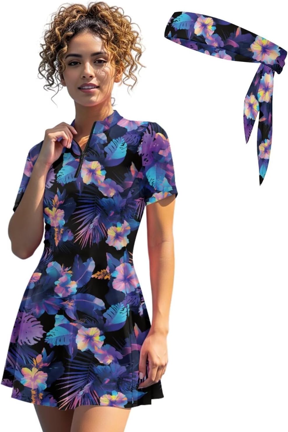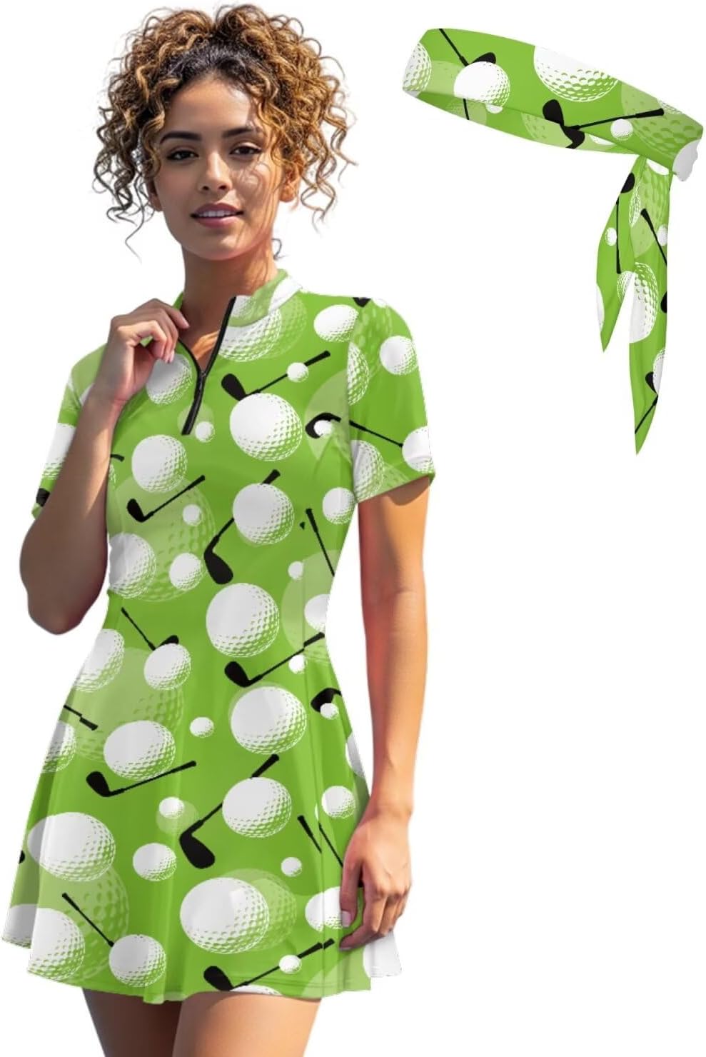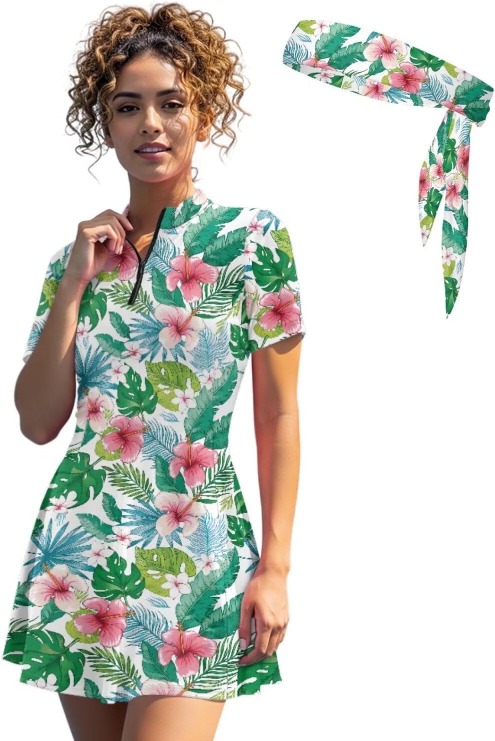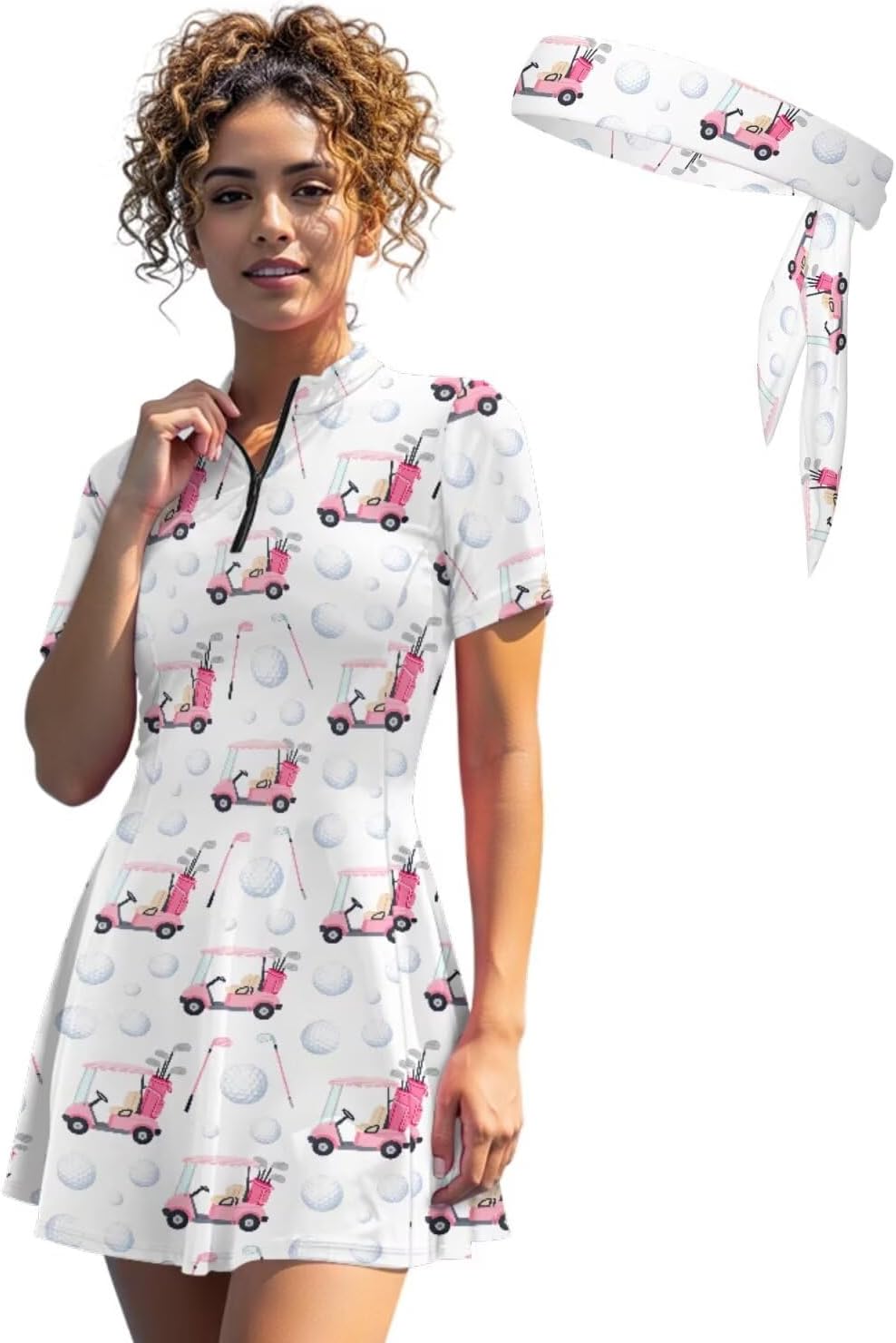 Suhoaziia's Womens Zip Front Tennis Dress V-Neck Short Sleeve Athletic Workout Dresses with Tennis Sweatbands 3 Pieces Pickleball Golf Outfits Build in Shorts with Pockets About Size (Inch): XS - Dress Length: 31.1''; Bust: 32.28''; Waist: 27.56''; Shorts Length: 12.6'' S - Dress Length: 31.89''; Bust: 33.86''; Waist: 29.13''; Shorts Length: 12.99'' M - Dress Length: 32.68''; Bust: 36.22''; Waist: 31.49''; Shorts Length: 13.39'' L - Dress Length: 33.46''; Bust: 38.58''; Waist: 33.86''; Shorts Length: 13.78'' XL - Dress Length: 34.25''; Bust: 41.73''; Waist: 37.01''; Shorts Length: 14.17'' 2XL - Dress Length: 35.04''; Bust: 44.88''; Waist: 40.16''; Shorts Length: 14.57'' Features: Slim fit, short sleeve, ruffle hem, functional zip-neck collar, short length Novelty Prints: Stylish pattern brings you a new experience, we have a variety of fun print for you to choose from, such as dog paws, hippie flowers, cow print, zebra stripes, sunflower, etc. If you want something different, try our casual sports dresses! Ideal Gifts: Great gift option for yourself, girlfriend, wife, mother, sister, daughter or friends on Birthday, Halloween, Thanksgiving, Christmas, Summer Vacation or Golf Games. Easy to care, suitable for all seasons.
