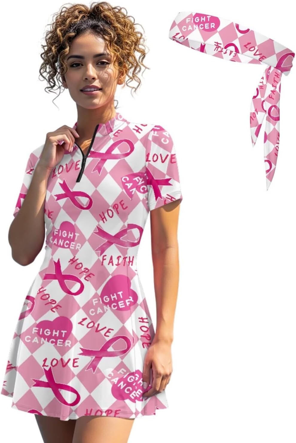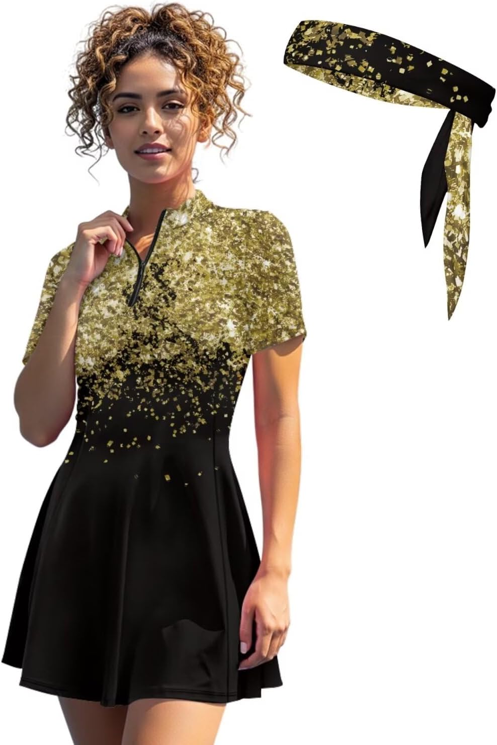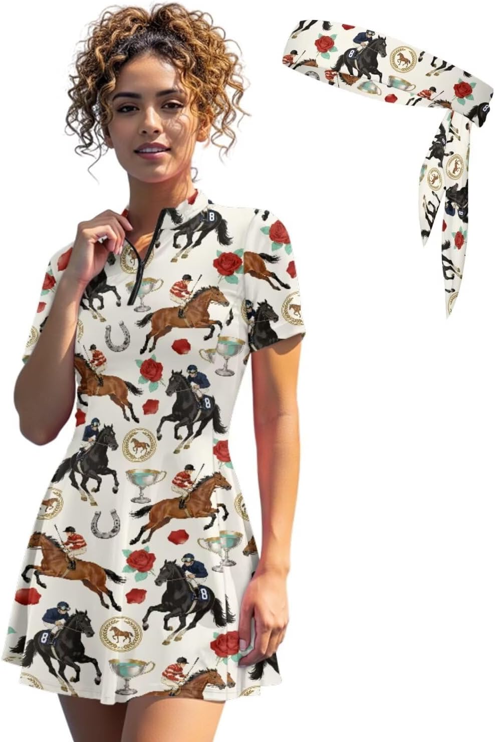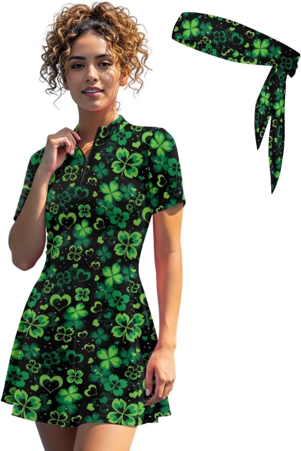Suhoaziia's Womens Zip Front Tennis Dress V-Neck Short Sleeve Athletic Workout Dresses with Tennis Sweatbands 3 Pieces Pickleball Golf Outfits Build in Shorts with Pockets About Size (Inch): XS - Dress Length: 31.1''; Bust: 32.28''; Waist: 27.56''; Shorts Length: 12.6'' S - Dress Length: 31.89''; Bust: 33.86''; Waist: 29.13''; Shorts Length: 12.99'' M - Dress Length: 32.68''; Bust: 36.22''; Waist: 31.49''; Shorts Length: 13.39'' L - Dress Length: 33.46''; Bust: 38.58''; Waist: 33.86''; Shorts Length: 13.78'' XL - Dress Length: 34.25''; Bust: 41.73''; Waist: 37.01''; Shorts Length: 14.17'' 2XL - Dress Length: 35.04''; Bust: 44.88''; Waist: 40.16''; Shorts Length: 14.57'' Features: Slim fit, short sleeve, ruffle hem, functional zip-neck collar, short length Novelty Prints: Stylish pattern brings you a new experience, we have a variety of fun print for you to choose from, such as dog paws, hippie flowers, cow print, zebra stripes, sunflower, etc. If you want something different, try our casual sports dresses! Ideal Gifts: Great gift option for yourself, girlfriend, wife, mother, sister, daughter or friends on Birthday, Halloween, Thanksgiving, Christmas, Summer Vacation or Golf Games. Easy to care, suitable for all seasons.