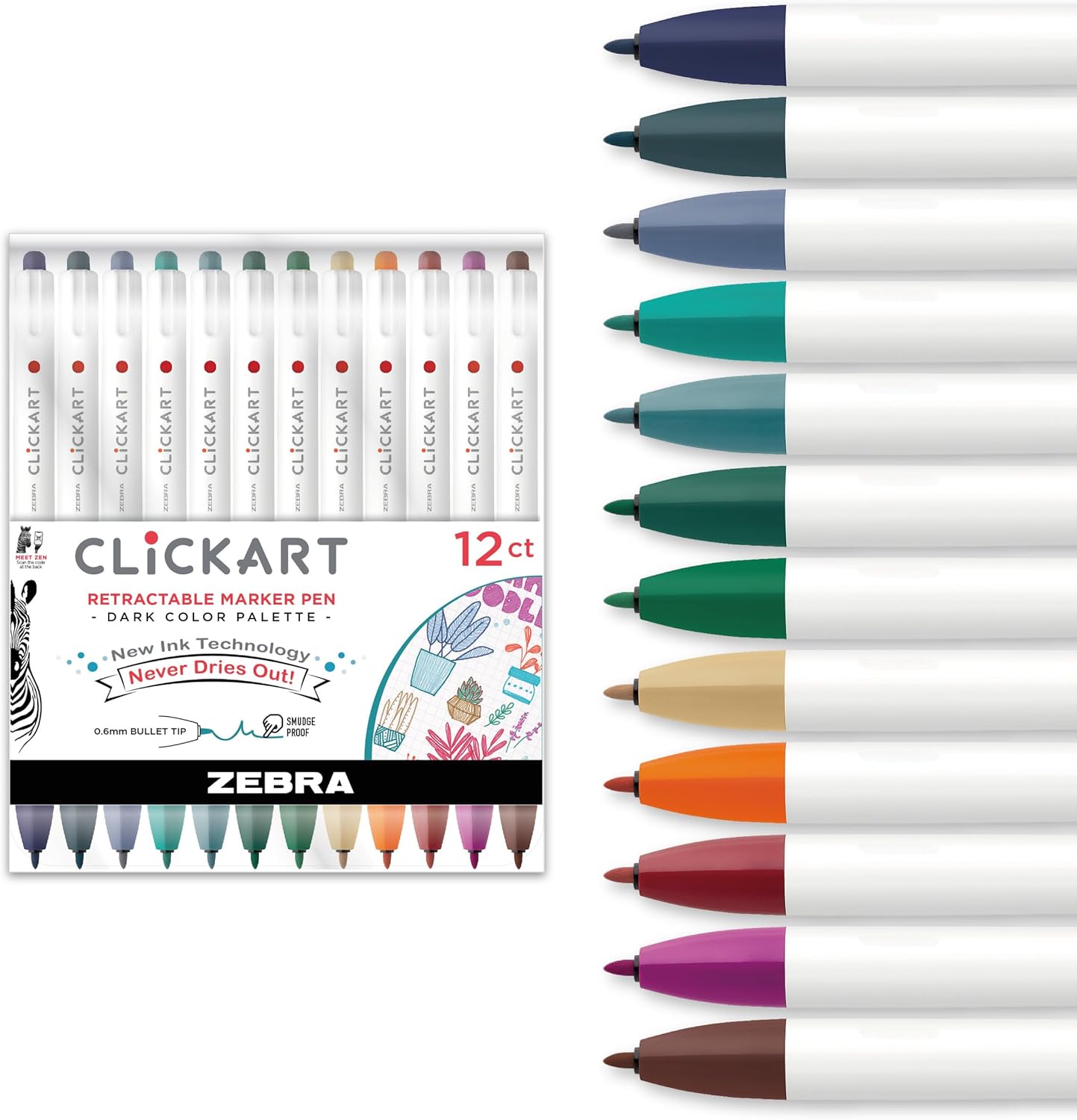 Introducing the Zebra Pen CLiCKART Retractable Marker Pen 36-Pack, the ultimate choice for all your teacher supplies, school supplies, and scrapbook supplies needs. These innovative markers cater to a wide range of uses, from educational settings to artistic endeavors. Whether you need markers for school, coloring, or drawing, the Zebra Pen CLiCKART collection is designed to meet the demands of both students and professionals alike. The Zebra Pen CLiCKART Retractable Marker stands out with its advanced retractable feature, eliminating the need for a cap and providing quick and easy access to your writing or drawing tool. This capless functionality is complemented by a clean white barrel, offering a sleek and modern design that is both practical and aesthetically pleasing. The retractable mechanism ensures that the pens are always ready for use, making them an essential addition to your school supplies. Each marker in the 36-pack is equipped with a fine 0.6mm point, perfect for precision work such as detailed illustrations, fine lines, and intricate designs. These fine-tip markers are particularly suitable for art projects, scrapbooking, and precise writing tasks. The set includes a variety of vibrant colored markers, allowing for a wide spectrum of creative possibilities. The Zebra Pen CLiCKART series features water-based ink with moisture-absorbing technology, ensuring that your lines remain crisp and clear without smudging or bleeding through paper and won’t dry out. This innovative ink formula is ideal for use in both educational and professional settings, offering reliable performance as art markers, felt tip markers, and drawing markers. Choose Zebra Pen CLiCKART markers for their unparalleled combination of functionality, style, and quality. These retractable markers are not just tools; they are an extension of your creativity, designed to enhance your artistic and educational experiences. Elevate your collection of fine point markers today and experience the difference with Zebra Pen CLiCKART.